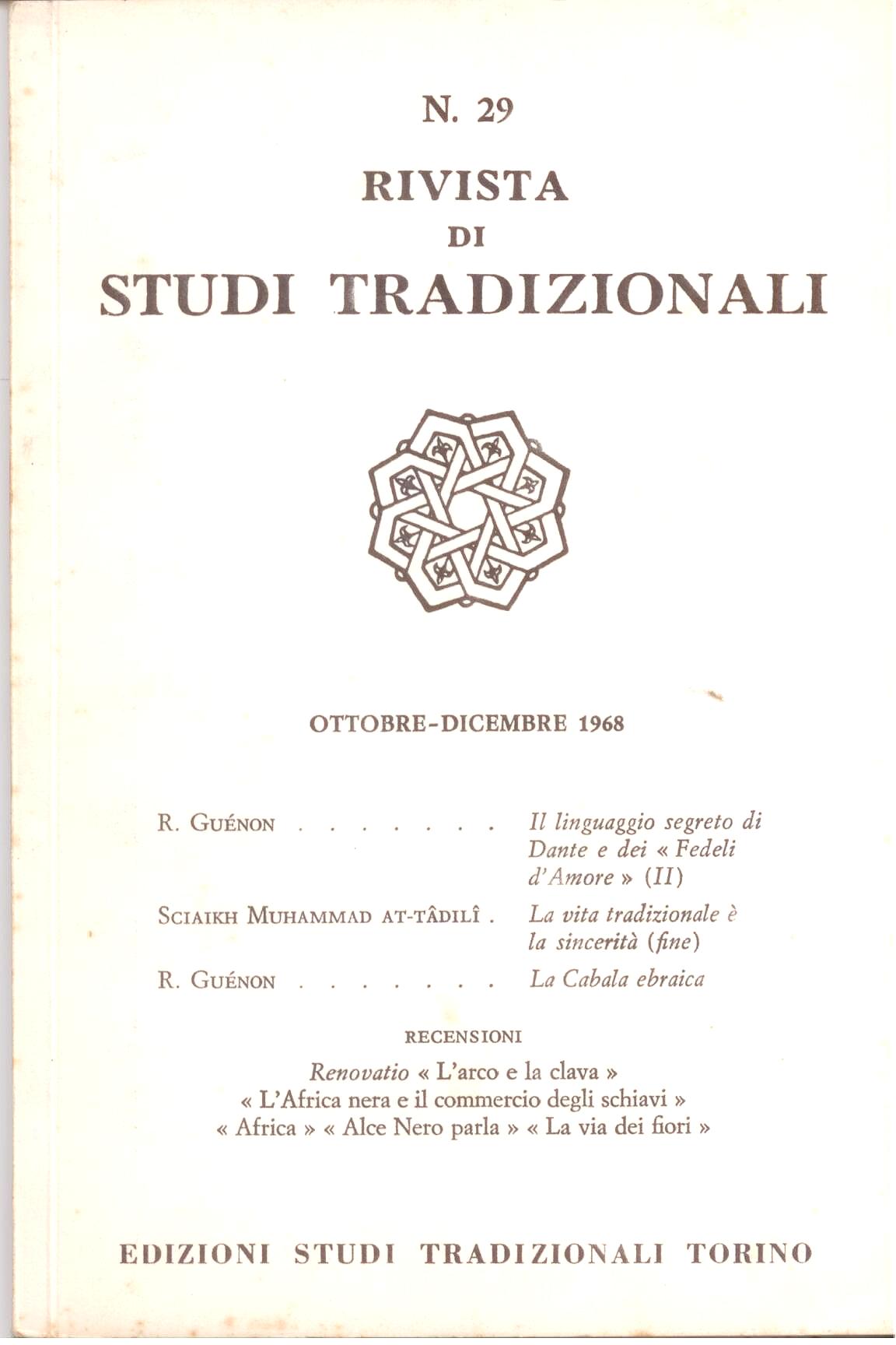 Guénon: Il linguaggio segreto di dante e dei Fedeli D'amore (parte II) Guénon: La cabala ebraica Sciaikh Muhammad At-Tadili: La verità tradizionale e la sincerità (fine) ristampa del numero originale fatta dall'editore in epoca successiva (cambia solo che la copertina è ad un solo colore) |