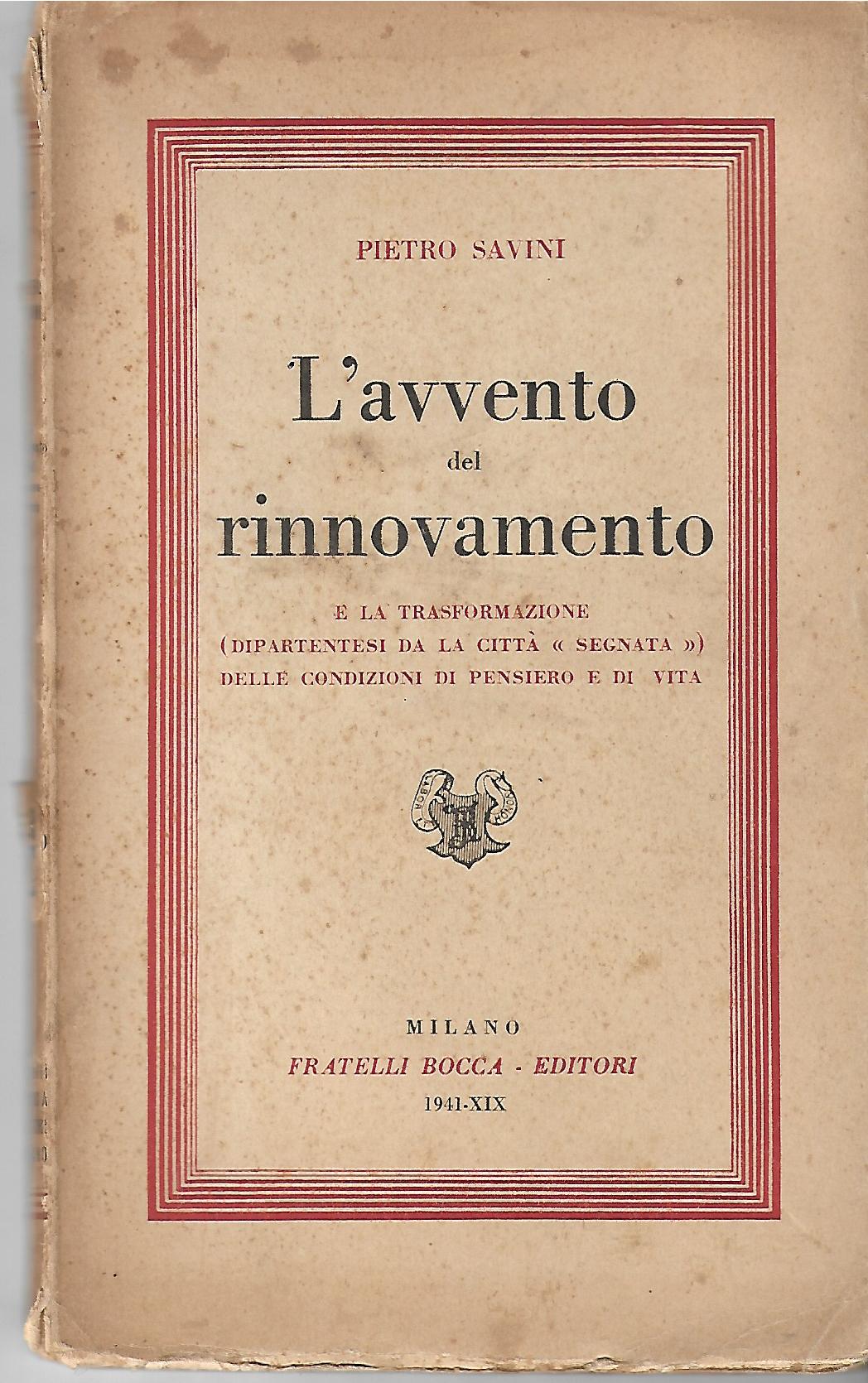 L'avvento del rinnovamento e la trasformazione (dipartentesi da la città "segnata") delle condizioni di pensiero e di vita. Collezione "problemi dello spirito" dall'Indice: parte I: I due Santuari dell'umanità; parte II: L'Apostolo delle genti e il suo ministerio di Carità e di Giustizia; parte III: Il problema della conoscenza nella dottrina cristiana. |