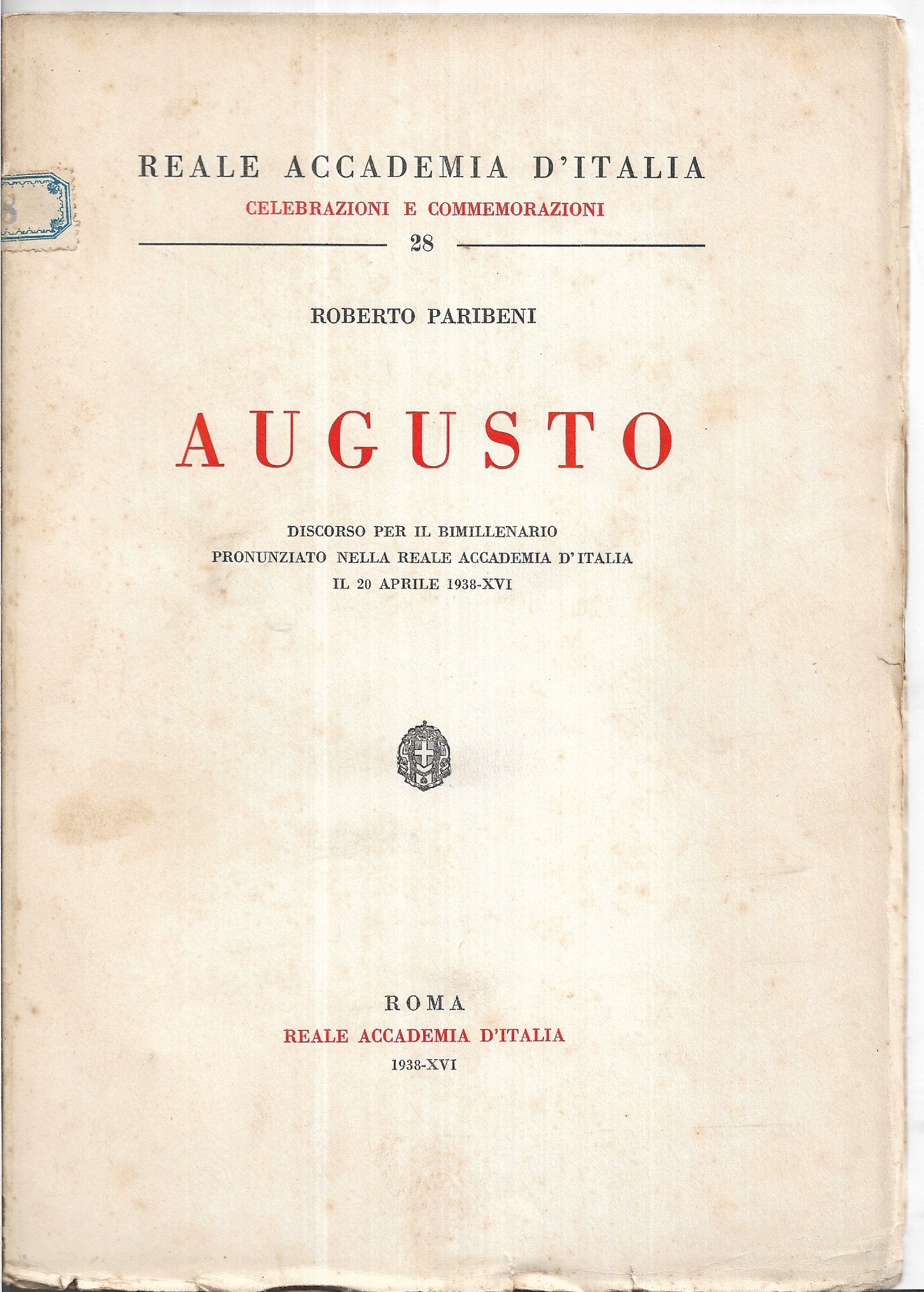 Discorso per il bimillenario pronunziato nella Reale Accademia d'Italia il 20 aprile 1938-XVI