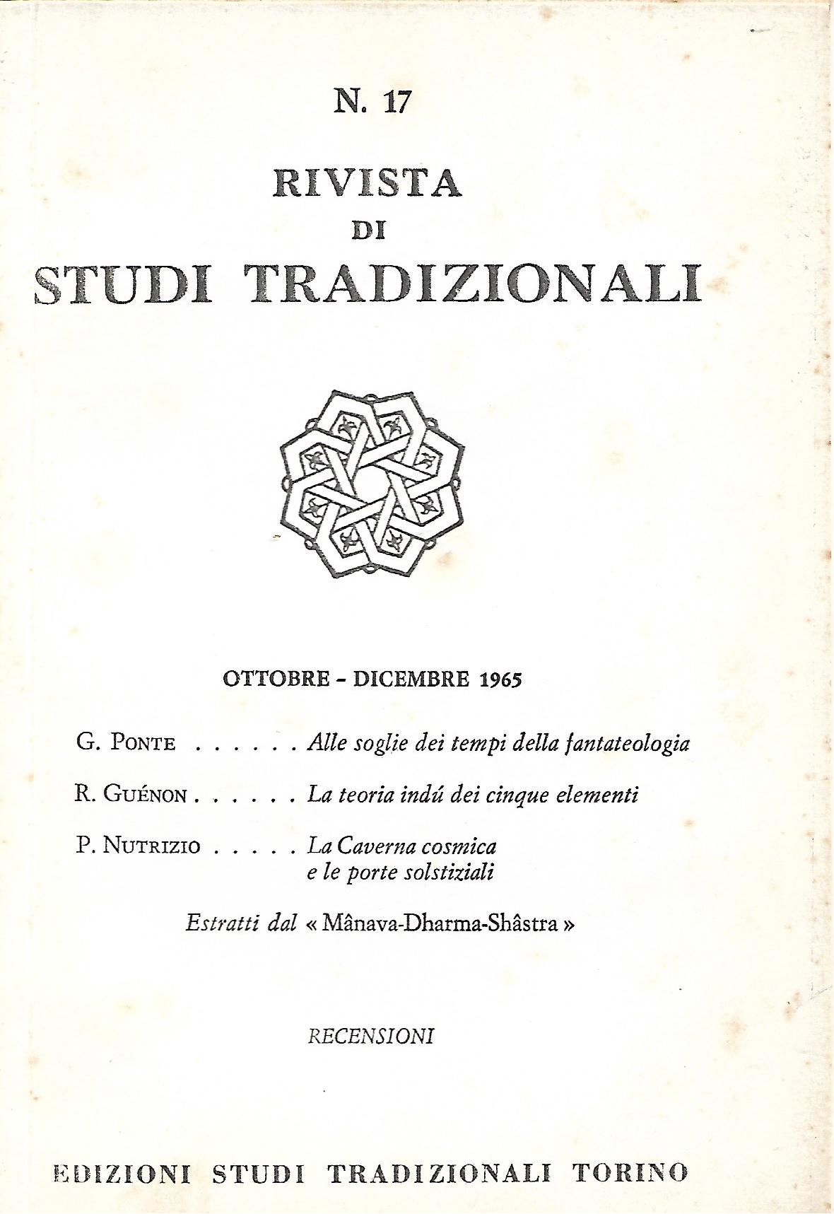- Ponte G., Alle soglie dei tempi della fantateologia - Guénon R., La teoria indù dei cinque elementi - Nutrizio P., La Caverna cosmica e le porte solstiziali - PRIMA PARTE ESTRATTI DAL Manava-Dharma-Shastra recensioni |