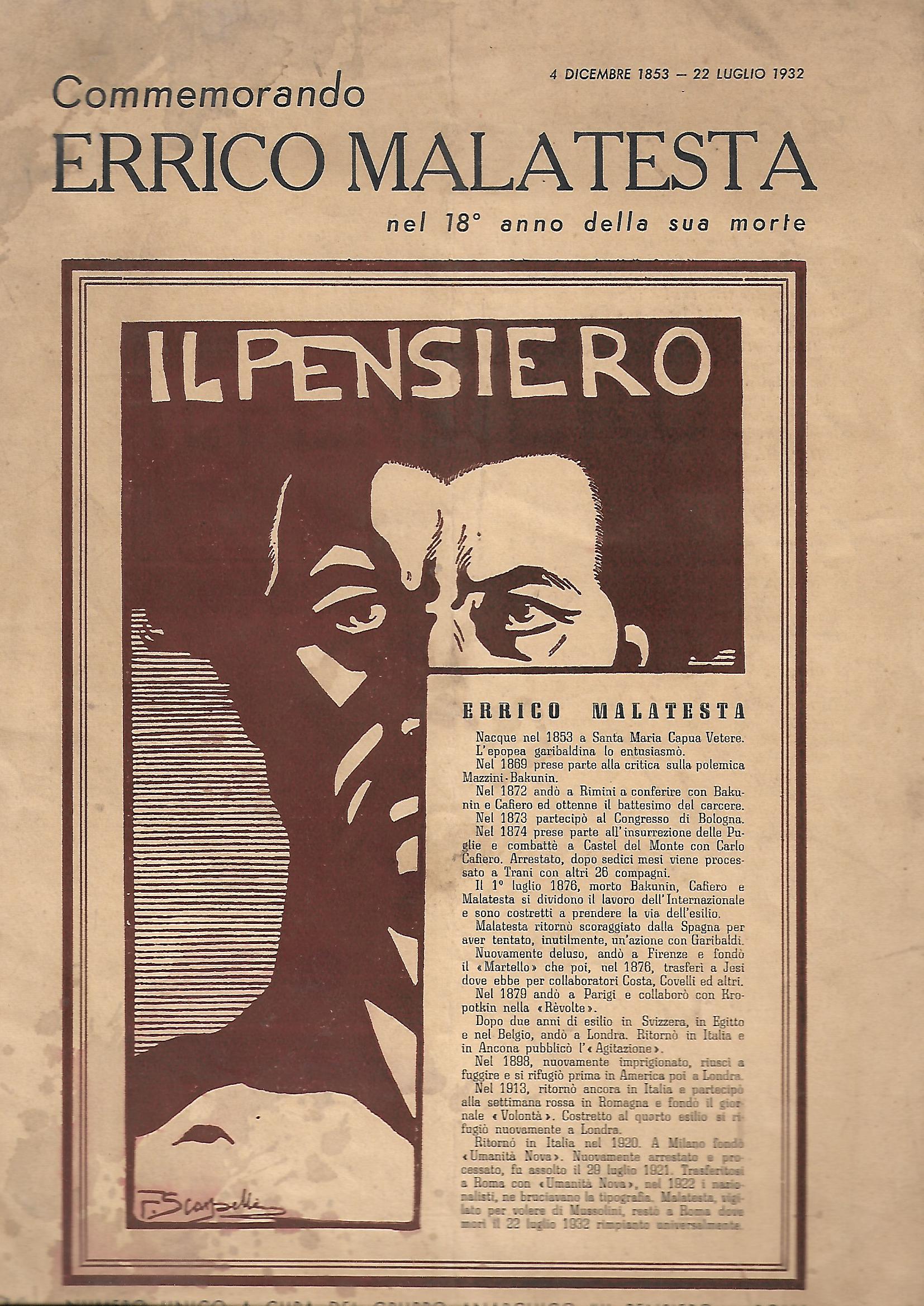 Numero unico a cura del Gruppo Anarchico "Il Pensiero" di Roma nel diciottesimo anniversario della morte di Malatesta. copertina leggermente logorata. interno ottimo