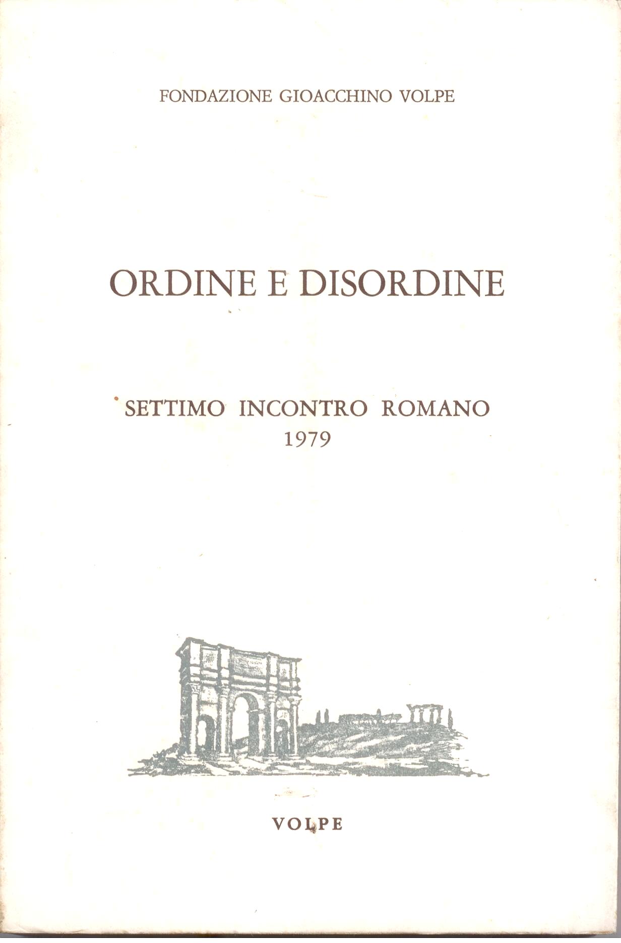 Prima seduta: Sei incontri (Nino Guglielmi); Il concetto di ordine (Julien Freund); La funzione del disordine (Michel Maffesoli). Seconda seduta: L'ordine nella lingua (Giuliano Bonfante); Per un positivo approccio all'ordine (Pierre-Philippe Arnaud). Terza seduta: Il problema dell'ordine nell'educazione (Klaus Hornung); L'ordine economico (Sergio Ricossa); Un errore grossolano di politica economica (G. Ugo Papi). Quarta seduta: L'ordine naturale ed il disordine giuridico (Michel Villey); Ordine e disordine (Marcel De Corte); Nostalgia dell'ordine (Francesco Grisi). Quinta seduta: Deforme, imforme, conforme (Gianfranco Morra); L'arte e la fuga dall'ordine (Vintila Horia); L'insidia gnostica (Augusto Del Noce). Sesta seduta: Ordine e creazione (Thomas Molnar); Scienza e ordine eterno (Giuseppe Sermonti); La concezione del'ordine morale e politico nel documenti del Concilio Vaticano II (Danilo Castellano), |