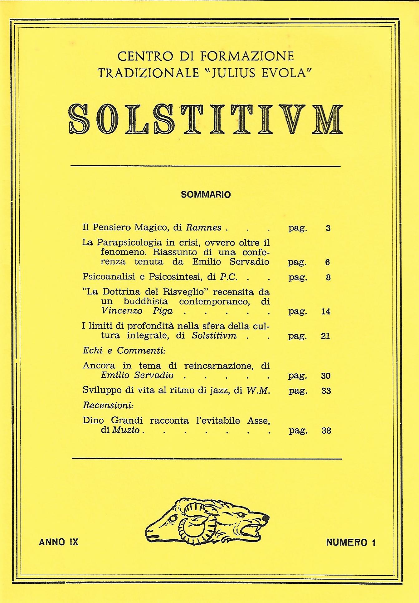 dal sommario - Il pensiero magico (Ramnes) - La parapsicologia in crisi (conferenza di Emilio Servadio) - Psicoanalisi e Psicosintesi - La Dottrina del Risveglio (di Evola) recensita da un buddhista (Vincenzo Piga) - I limiti di profondità nella sfera della cultura integrale - Ancora in tema di reincarnazione (Emilio Servadio) - Sviluppo di vita al ritmo di Jazz - Dino Grandi racconta l'evitabile Asse (Muzio) |