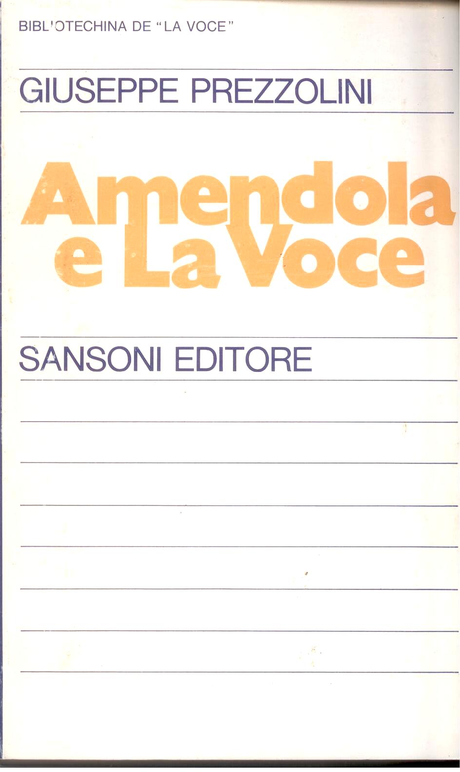 Il libro raccoglie le sue lettere a Prezzolini e quanto detto a La Voce in parte ignoto perchè apparso nei corsivi della direzione. Un lungo saggio amichevolmente polemico di Prezzolini illumina le vicende della sua collaborazione punteggiata da frequenti dissensi e da dimissioni. Nel testo si trova anche la prima biografia di Amendola scritta dallo stesso Prezzolini nel 1926 durante il fascismo. |