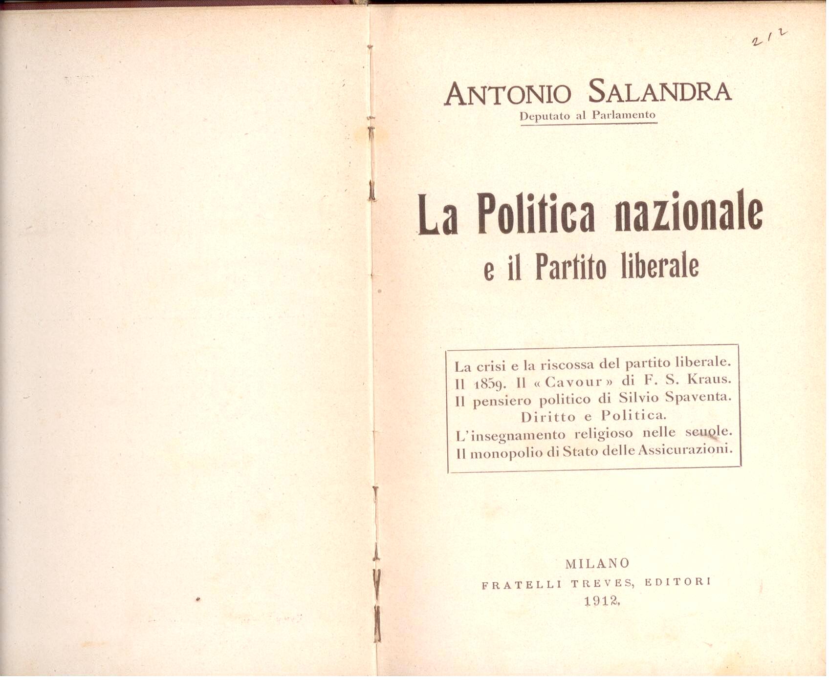 La crisi e la riscossa del partito liberale. Il 1859. Il Cavour di F.S. Kraus. Il pensiero politico di Silvio Spaventa. Diritto e politica. L'insegnamento religioso nelle scuole. Il monopolio di Stato delle Assicurazioni. |