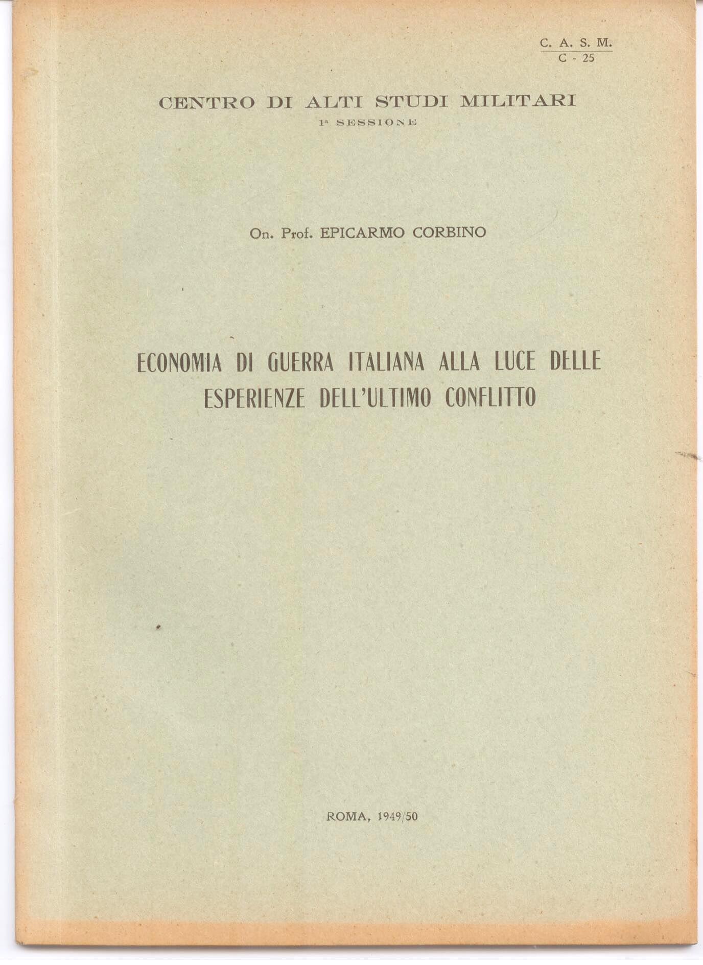 titolo completo della conferenza: "Economia di guerra italiana alla luce delle esperienze dell'ultimo conflitto" tenuta dall'On. Prof. Epicarmo Corbino. |
