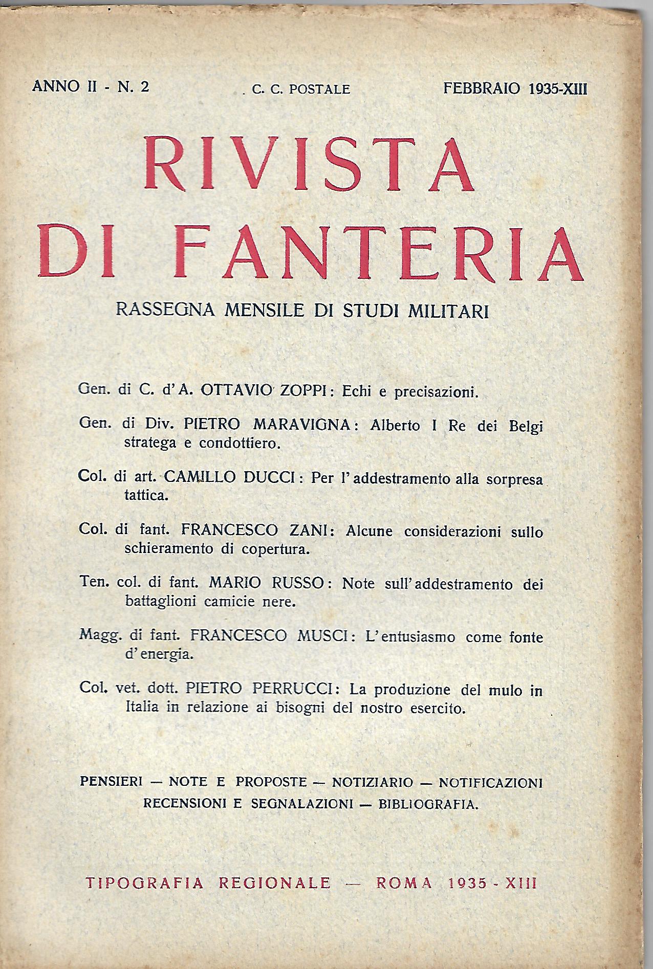 sommario: - Echi e precisazioni (gen. Ottavio Zoppi) - Alberto I re dei belgi stratega e condottiero (Gen. Pietro Maravigna) - Per l'addestramento alla sorpresa tattica (Col. Camillo Ducci) - Alcune considerazioni sullo schieramento di copertura (Col. Francesco Zani) - Note sull'addestramento dei battaglioni camicie nere (ten.col. Mario Russo) - L'entusiasmo come fonte di energia (magg. Francesco Musci) - La produzione del mulo in Italia in relazione ai bisogni del nostro esercito (Col. Pietro Ferrucci) rubriche varie |