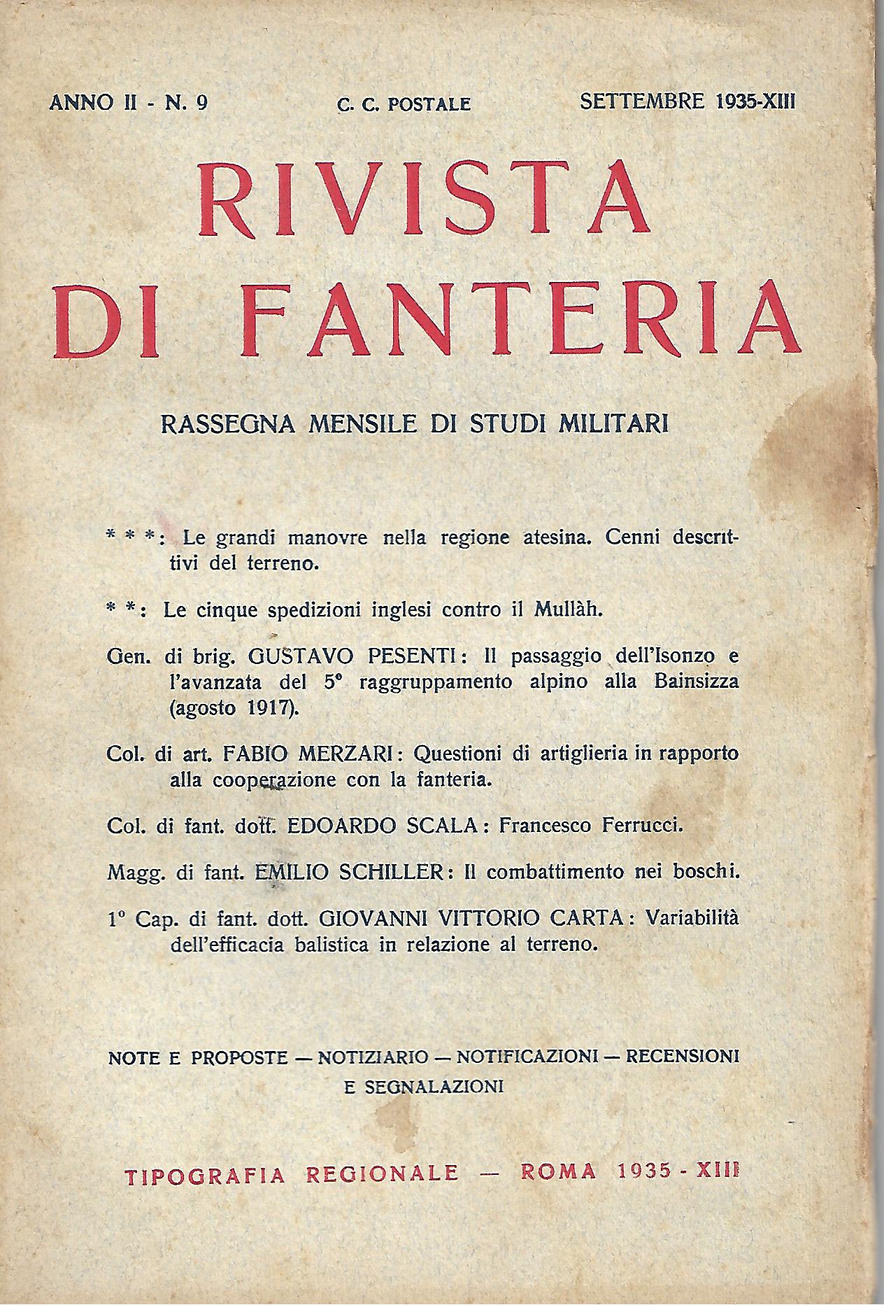 con una cartina ripiegata: schizzo ipsometrico della regione atesina sommario: - Le grandi manovre nella regione atesina. Cenni descrittivi del terreno - Le ciinque spedizioni inglesi contro il Mullàh - Il paesaggio del'Isonzo e l'avanzata del 5° raggruppamento alpino alla Bainsizza - Agosto 1917 (Gen. Gustavo Pesenti) - Questioni di artiglieria in rapporto alla cooperazione con la fanteria (Col. Fabio Merzari) - Francesco Ferruccio (Col. Edoardo Scala) - Il combattimento nei boschi (Magg. Emilio Schiller) - Variabilità del'efficacia balistica in relazione al terreno (Cap. Giovanni Vittorio Carta) Rubriche varie |